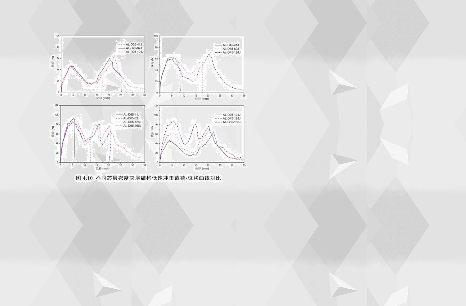 為了了解泡沫芯層對夾層結構沖擊性能的影響,分別選擇了三種不同芯層密度和三種不同芯層高度的夾層結構作為研究對象,需要特別說明的是,這六種配置的試件,其面板均由厚度相同的鋁合金制成。圖4.10為相同配置夾層結構在不同沖擊能量下及不同芯層密度的試件在穿透能下的載荷-位移曲線,通過對比可以看出,當芯層密度從0.45g/cm3增加到0.65g/cm3時,載荷-位移曲線的形式發生了很大變化,曲線的峰值載荷由兩個變為三個,且曲線的波峰和波谷均隨芯層密度的增加而增加。