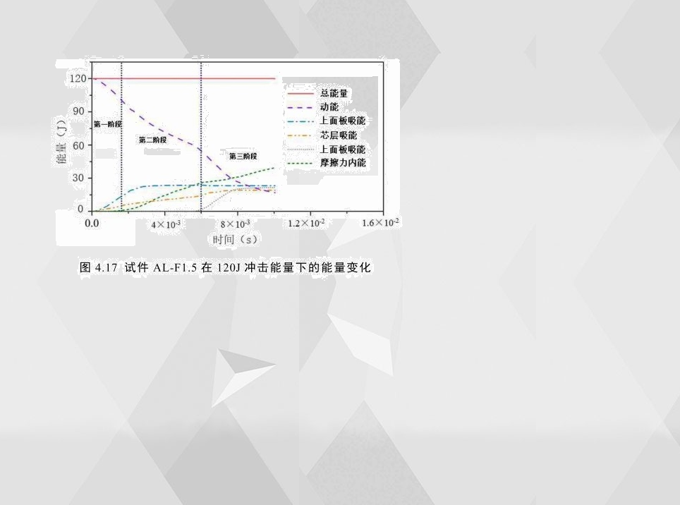圖4.17為試件AL-F1.5的各組成部分在低速沖擊仿真中能量變化。從圖中可以看出,初始沖擊能量主要由上下面板、泡沫鋁芯層的內(nèi)能以及各組成部分的摩擦能四部分組成。從各部分能量轉(zhuǎn)化趨勢可以看出,整個沖擊過程基本可以分為三個階段。第一階段主要由上面板吸收能量,摩擦力做功較少。第二階段摩擦力做功迅速增加,成為主要吸能部分。第三階段由于下面板發(fā)生較大塑性變形,下面板成為主要吸能部分。